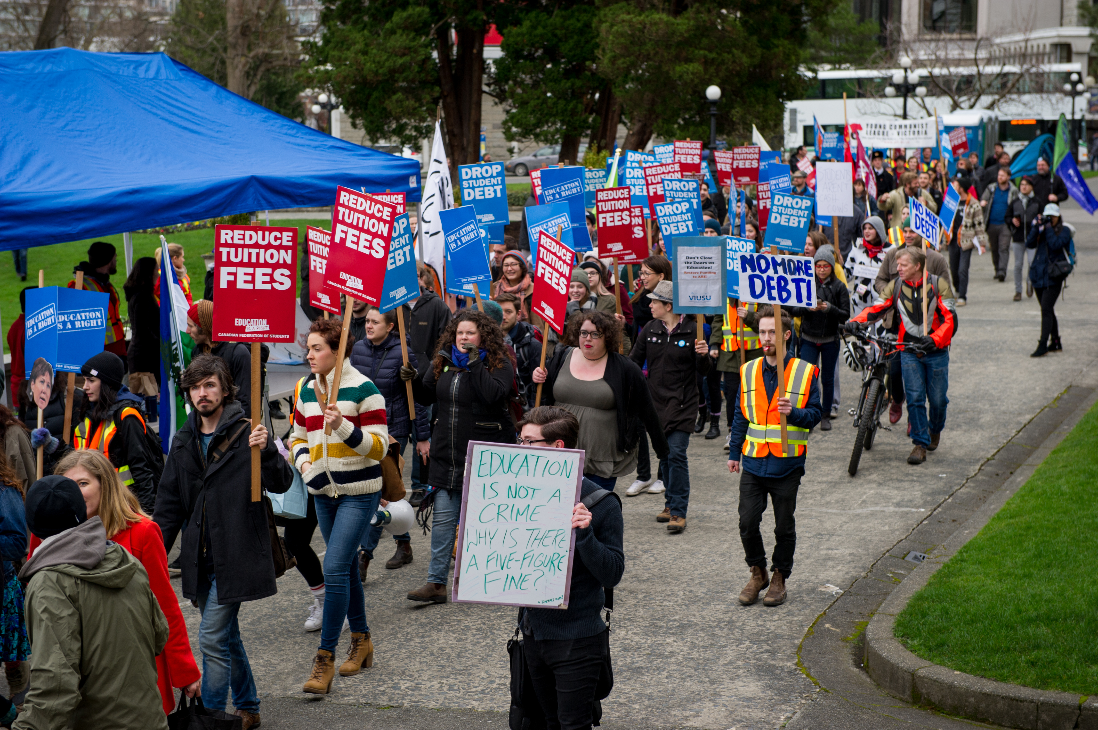 The PEA showed it’s support, joining 350 students on the march from Centennial Square to the BC Parliament Buildings. CFAX 1070 and CTV were onsite reporting on the issue, which prompted a response from the minister, and a counter-response from the Camosun Student Society. Despite the shutdown of Government street, many inconvenienced motorists honked in support. Rousing speeches were given on the steps of the legislature by the UVSS, CUPE 4163, student advocates, and NDP MLAs.