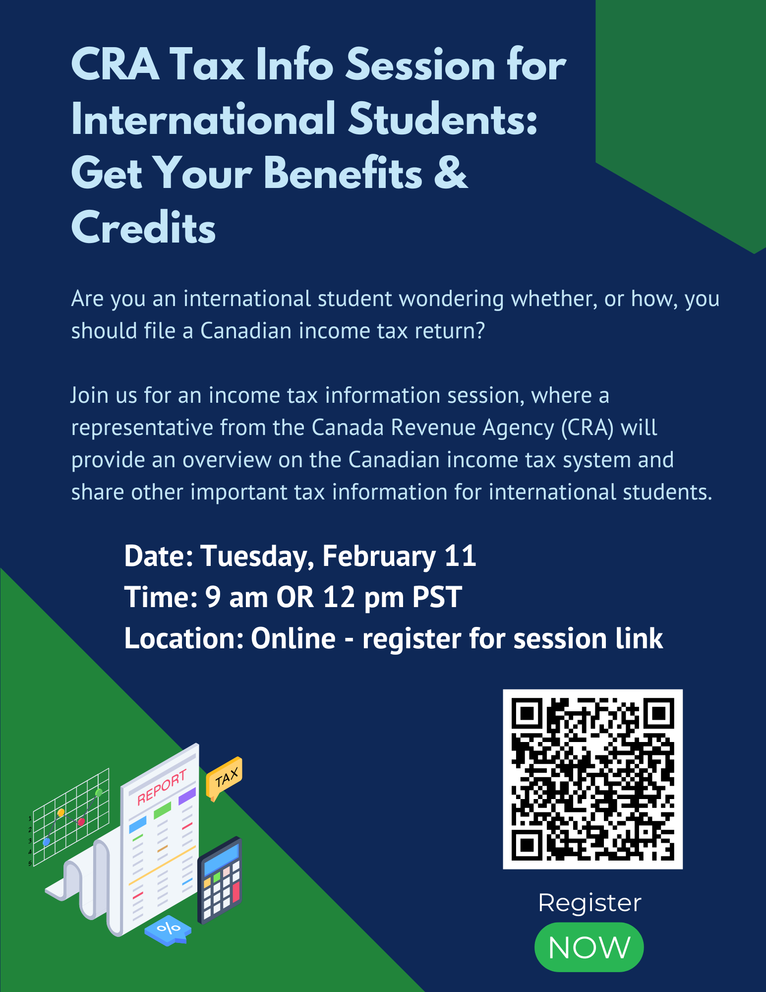 Are you an international student wondering whether, or how, you should file a Canadian income tax return? Join the International Centre for Students and Gustavson School of Business for an income tax information session, where a representative from the Canada Revenue Agency (CRA) will share information on receiving benefits and credits, working in Canada, ways to do your taxes, Community Volunteer Income Tax program (CVITP), how to be scam smart, and more.