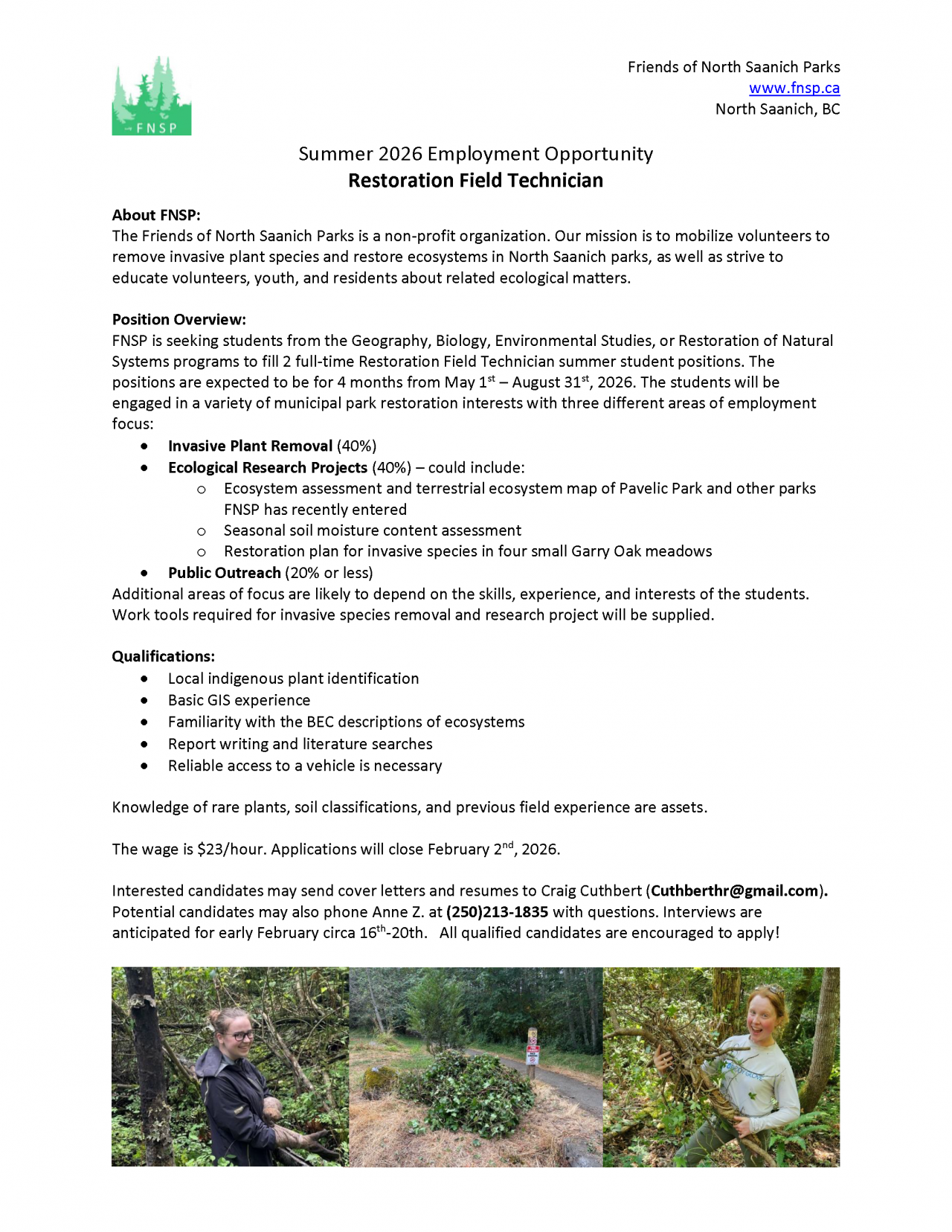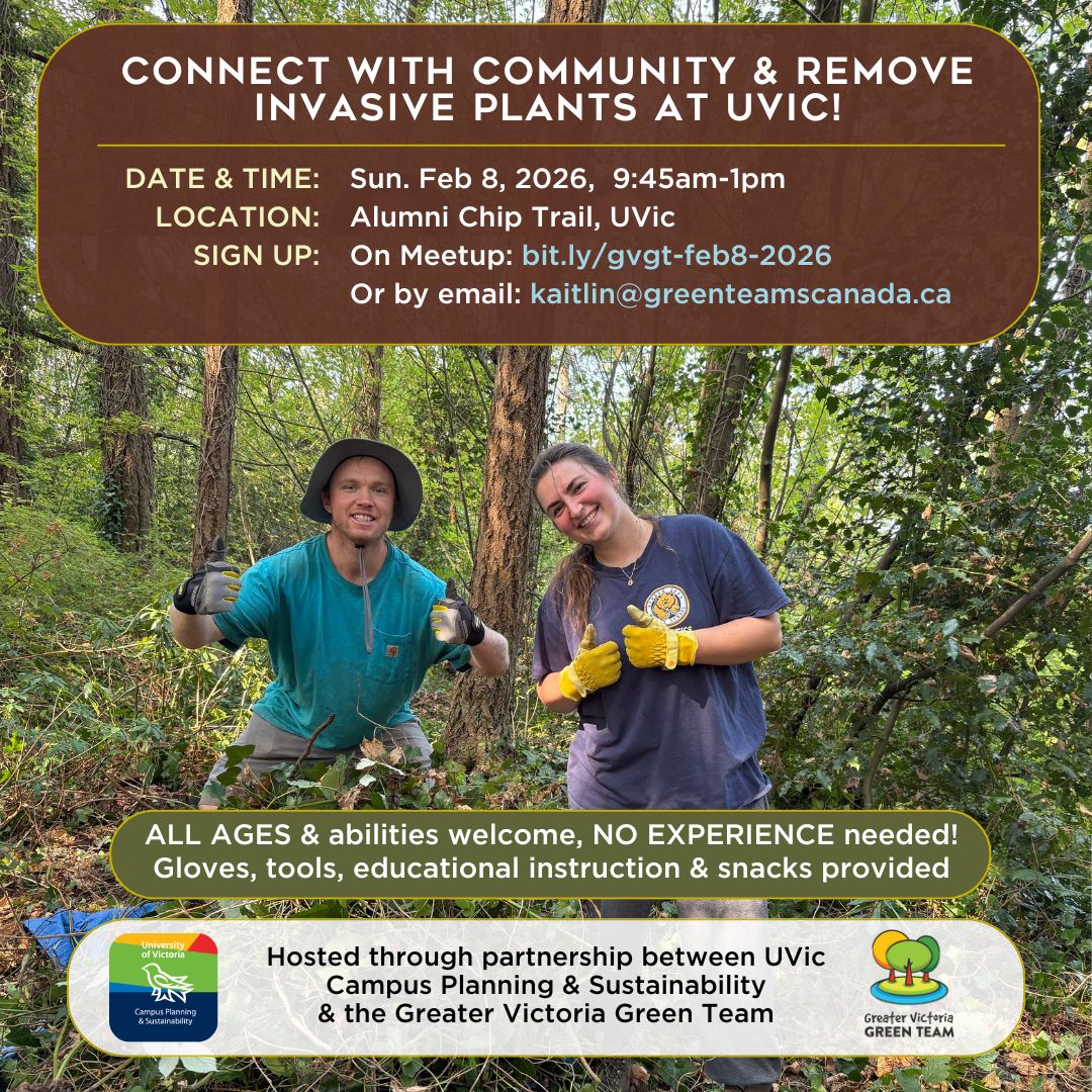 The Greater Victoria Green Team will be hosting a habitat restoration activity at UVic to remove invasive plants on Feb. 8th that we’d love for you to join and share with your community! This is a fun, hands-on opportunity to spend time outdoors, meet people, and make a real difference for the local ecosystem!