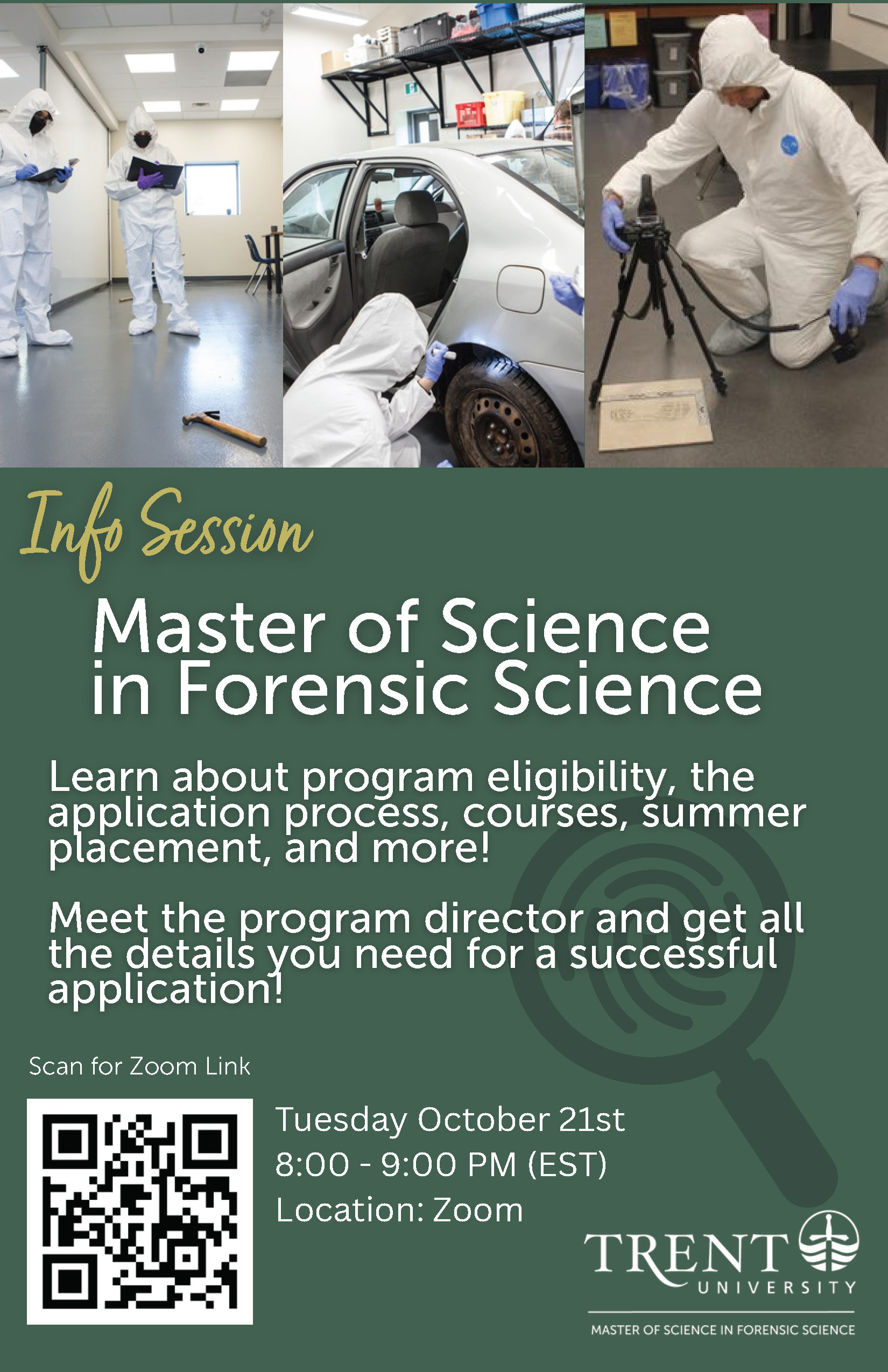 We are excited to invite you to our upcoming Zoom session dedicated to those interested in pursuing graduate studies in Forensic Science. This will be an information session for the September 2026 intake in the MScFS program. If you’ve been considering advancing your education, better preparing yourself for the job market, or both, this is the perfect opportunity to learn more about our MSc. Forensic Science program at Trent University. We are currently accepting applications; our early application deadline is November 1, 2025.