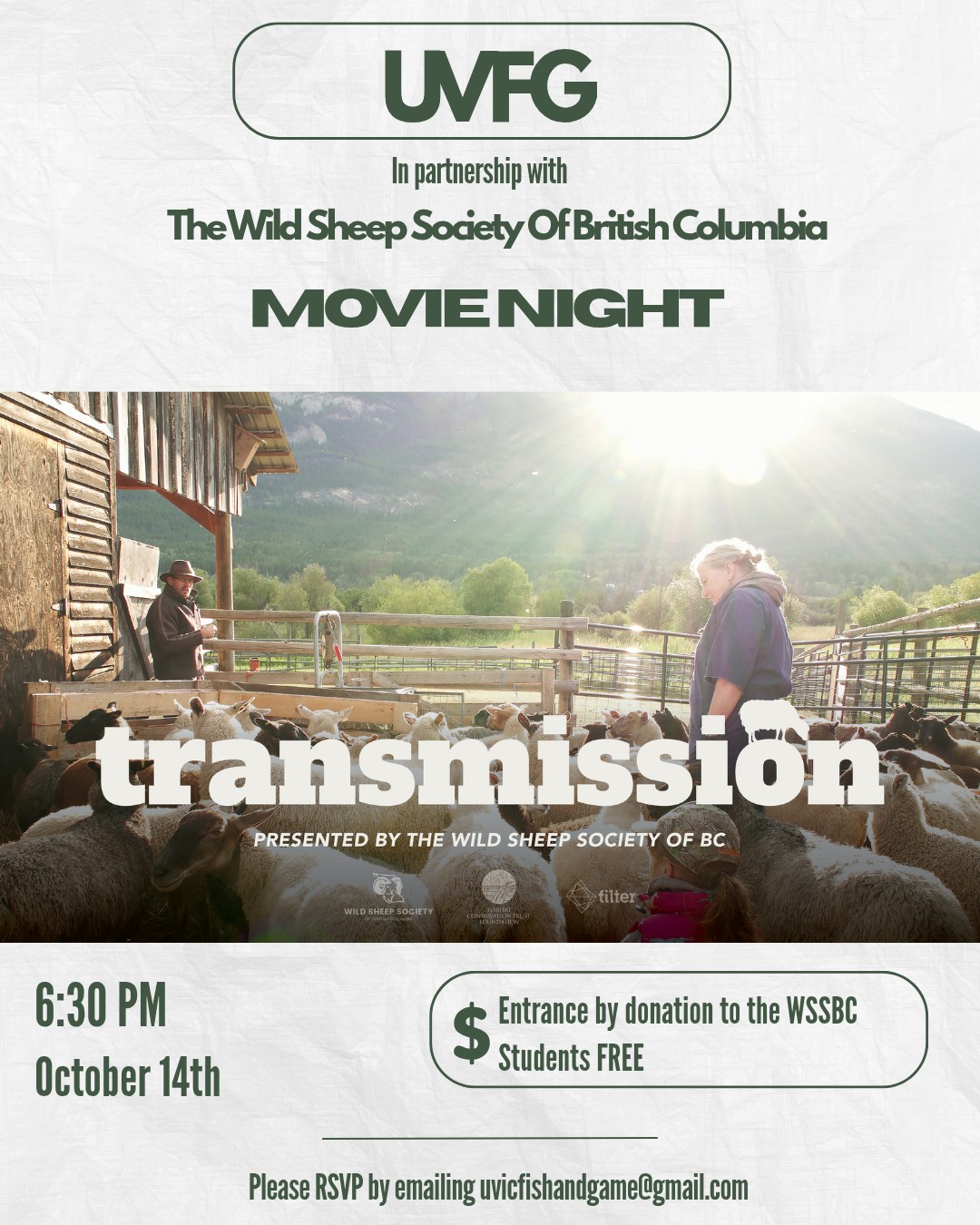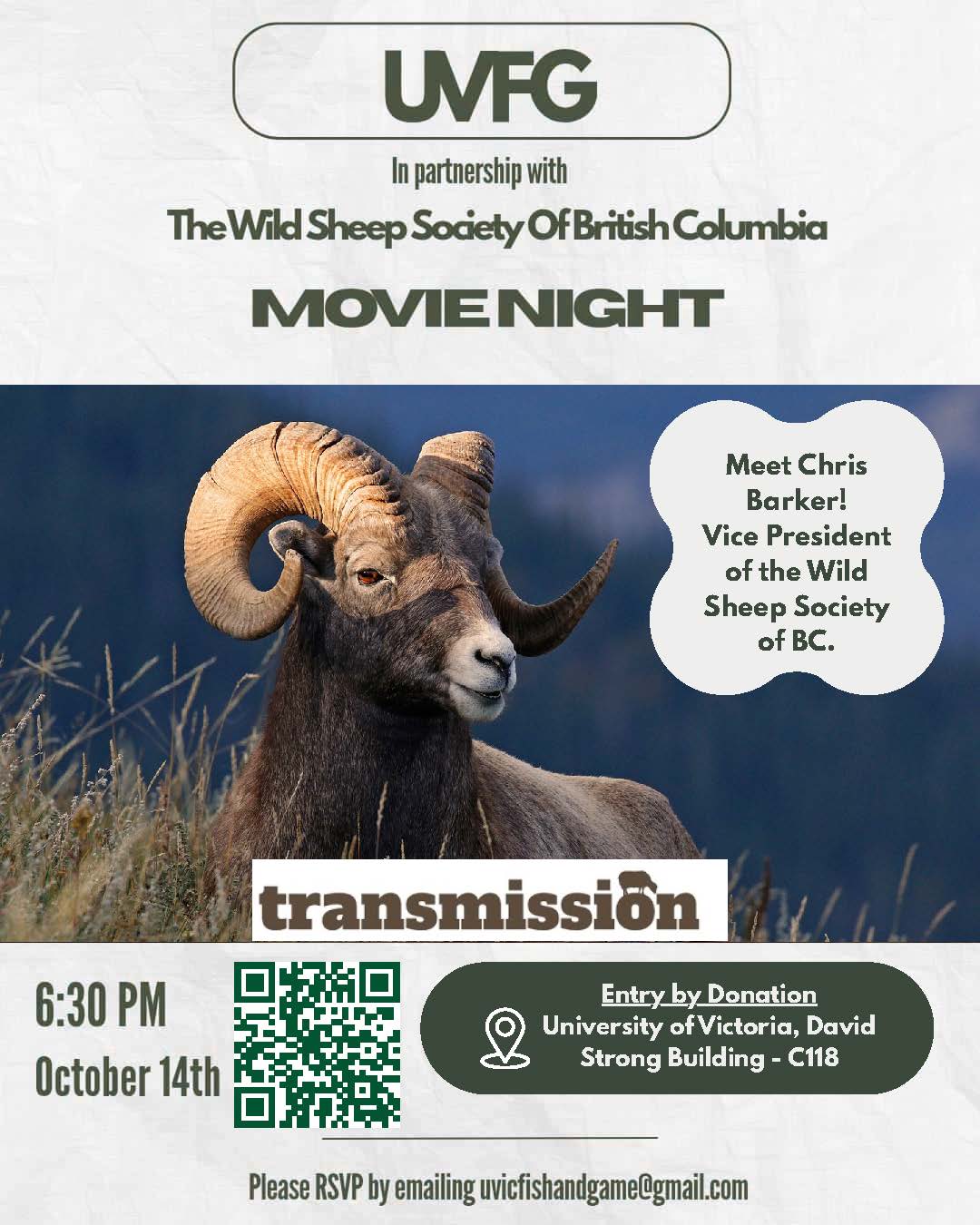On October 14th The UVic Fish and Game club together with Wild Sheep Society will be hosting a movie night where the film Transmission will be shown. The plan for the night is to show the movie and then have a short question and answer period with Kyle Stelter (WSSBC President), hopefully more of the WSSBC team and film production team (we are just waiting to hear back), and the lead biologist from the film (Dr. Helen Schwantje).