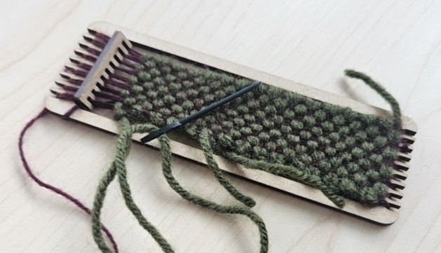 It uses a tapestry needle to weave the weft threads through alternating warp threads. Our tapestry needles are 3D printed, allowing them to be customized for length and eye size!