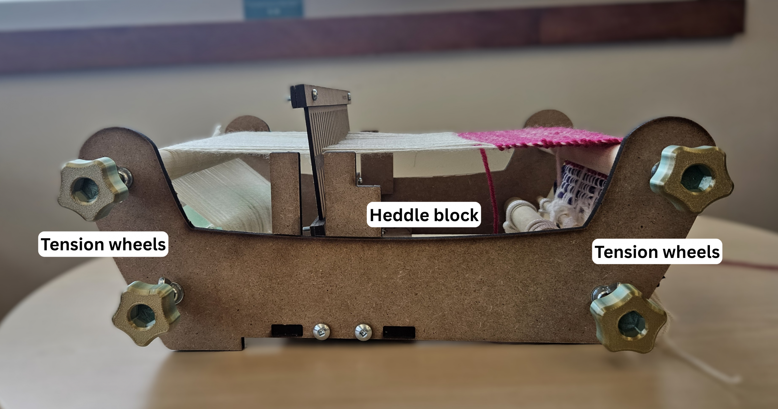 The tension wheels feed the warp threads through the loom. They can be loosened to allow cloth to be rolled onto the cloth beam, which also pulls more warp into the working space of the loom.