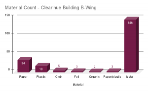 Our tabulated data counts for the Clearihue location, which houses faculty offices such as those of the Gender Studies department. Graph created by the “garbage disposal unit” group.