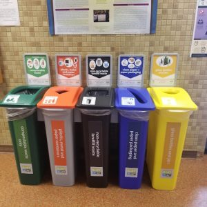 These were the waste management bins available at our second sorting location in the Clearihue building. This sort-it-out station has each type of bin available. Photo taken by Meaghan Bergman.