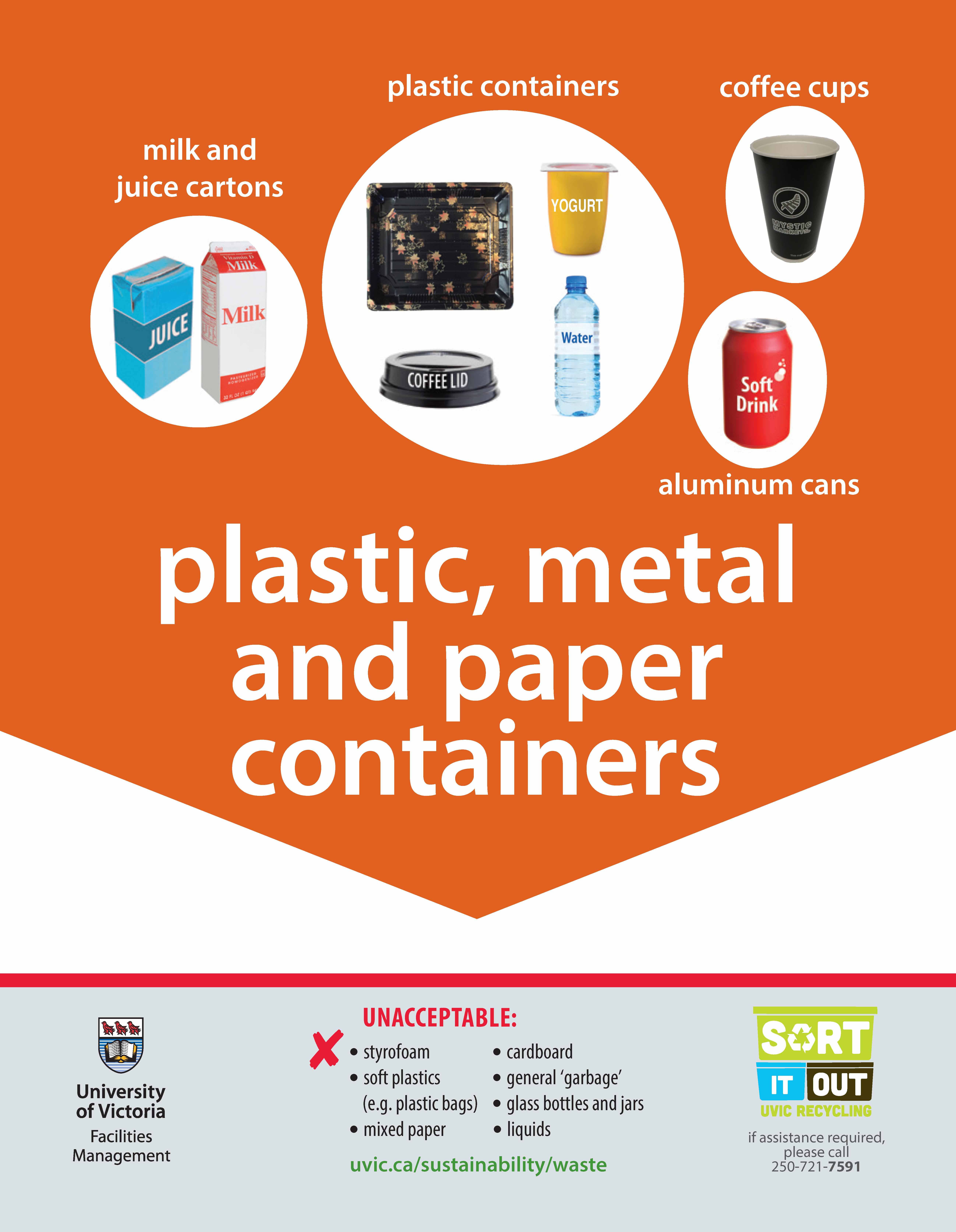 Our group also pinpointed the signage on bins as a major factor in guiding the UVic population’s recycling practices. What we currently see on bin signage is about 80% of the bin’s sign dedicated to displaying what should be going into the bin with the type of materials that shouldn’t be deposited displayed in a fine print found at the bottom of the sign. Since we chose to focus on the orange bin, which is where the majority of coffee related waste goes, we think that the soiling of paper recyclables, such as coffee cups and sleeves, can be reduced by a redesigning of the bin’s signage to emphasize that liquid coffee DOES NOT go into the Containers bin.