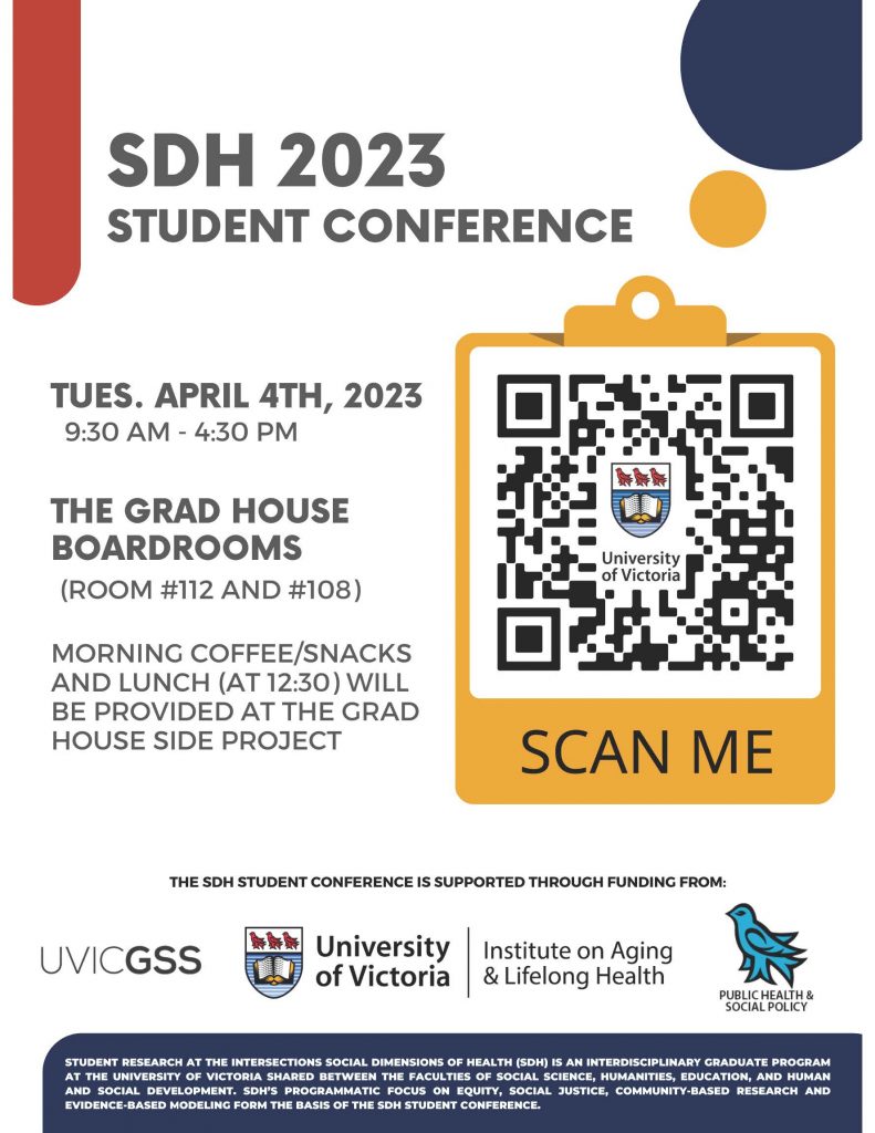 Social Dimensions of Health (SDH) is an interdisciplinary graduate program at the University of Victoria shared between the faculties of Social Science, Humanities, Education, and Human and Social Development. SDH’s programmatic focus on equity, social justice, community-based research and evidence-based modeling form the basis of the SDH Student Conference. Every two years, SDH students host a conference to share their research with one another and the community. The fourth bi-annual conference will take place on Tuesday, April 4, 2023 from 9:30am to 4:30pm in-person at the University of Victoria and via Zoom. The conference is being held at The Grad House boardrooms (Room 112 and Room 108).