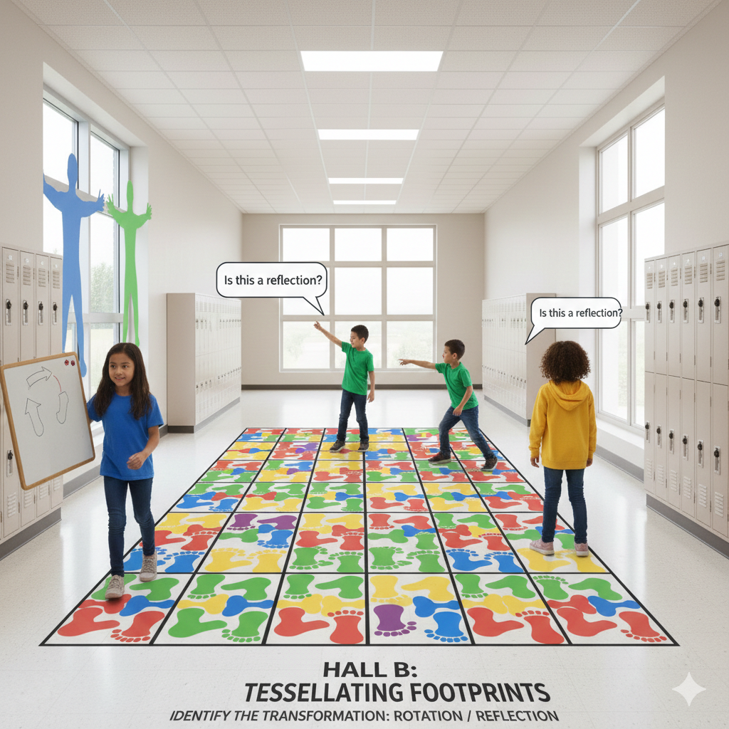 | Hall B | Tessellating Footprints | Spatial Sense: Identify the transformation (Rotation/Reflection). |