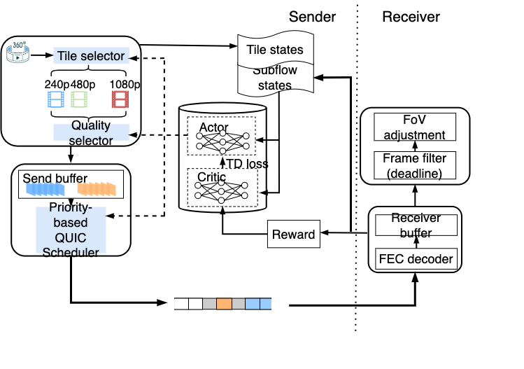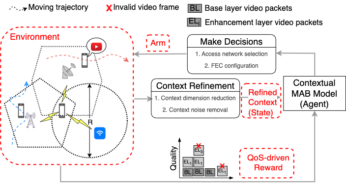In response to the above challenges, we designed a QoS-driven contextual multi-armed bandit (QC-MAB) framework as shown in the above figure for MPQUIC to support video streaming in mobile networks. To improve learning efficiency, QC-MAB identifies the most relevant features that affect QoS requirements and then incorporates them into context space. Each arm of QC-MAB is composed of two actions: access network selection and forward error correction (FEC) configuration. Selecting a reliable access network can effectively mitigate the negative impact of mobility on QoS, and whether a packet-level FEC is enabled or not depends on the reliability and delay requirements, as well as the bottleneck bandwidth, delay, and loss rate of each path. Finally, the reward function of QC-MAB is closely related to the pre-defined QoS requirements. The QC-MAB learning agent performs the Upper Confidence Bound (UCB) algorithm to solve the exploration vs. exploitation dilemma, taking reasonable actions to ensure video service requirements.