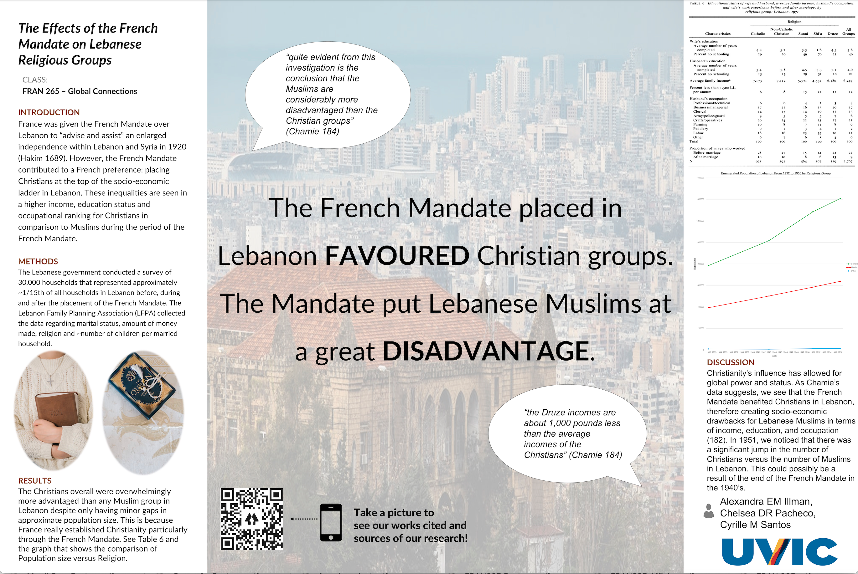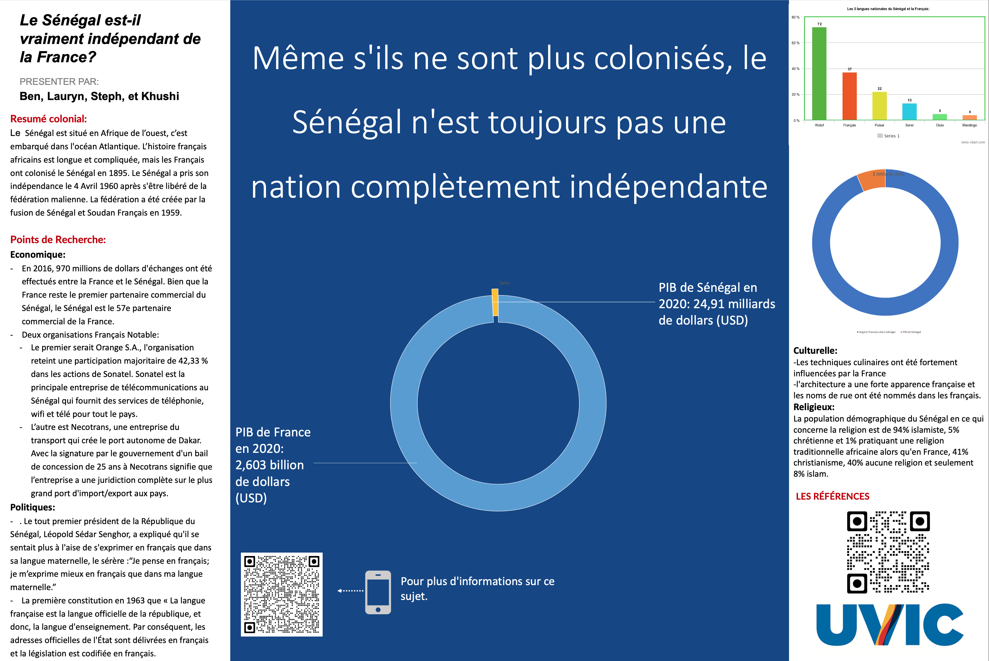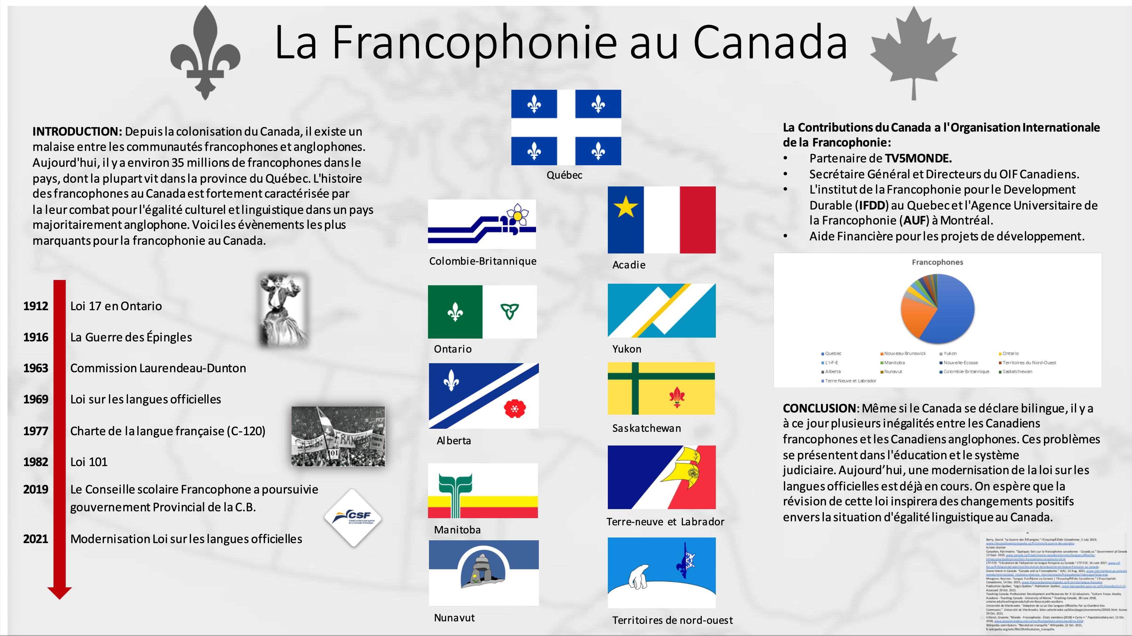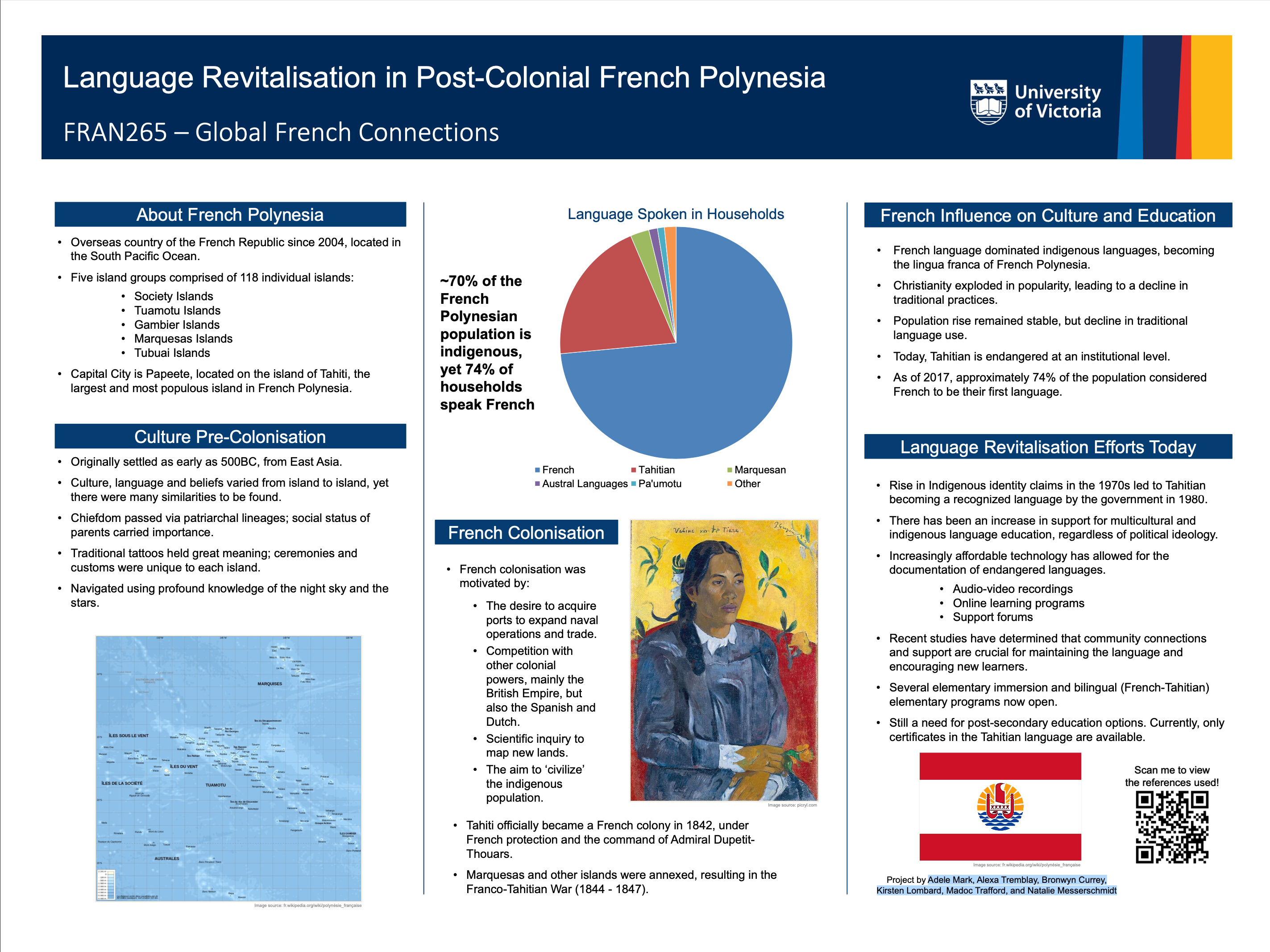 Le salon de la recherche a eu lieu en soirée le 4 novembre 2021 dans l'atrium du Bob Wright Centre, à UVic. Dans le cadre de cette activité, les étudiant·e·s du cours FRAN 265—Global French Connections, offert par le professeur Pierre-Luc Landry, ont réalisé des affiches de recherche sur un sujet touchant de près ou d'un peu plus loin aux espaces francophones à travers le monde. Nous vous invitons à découvrir les résultats de cet événement en consultant ci-dessous les affiches en format électronique.