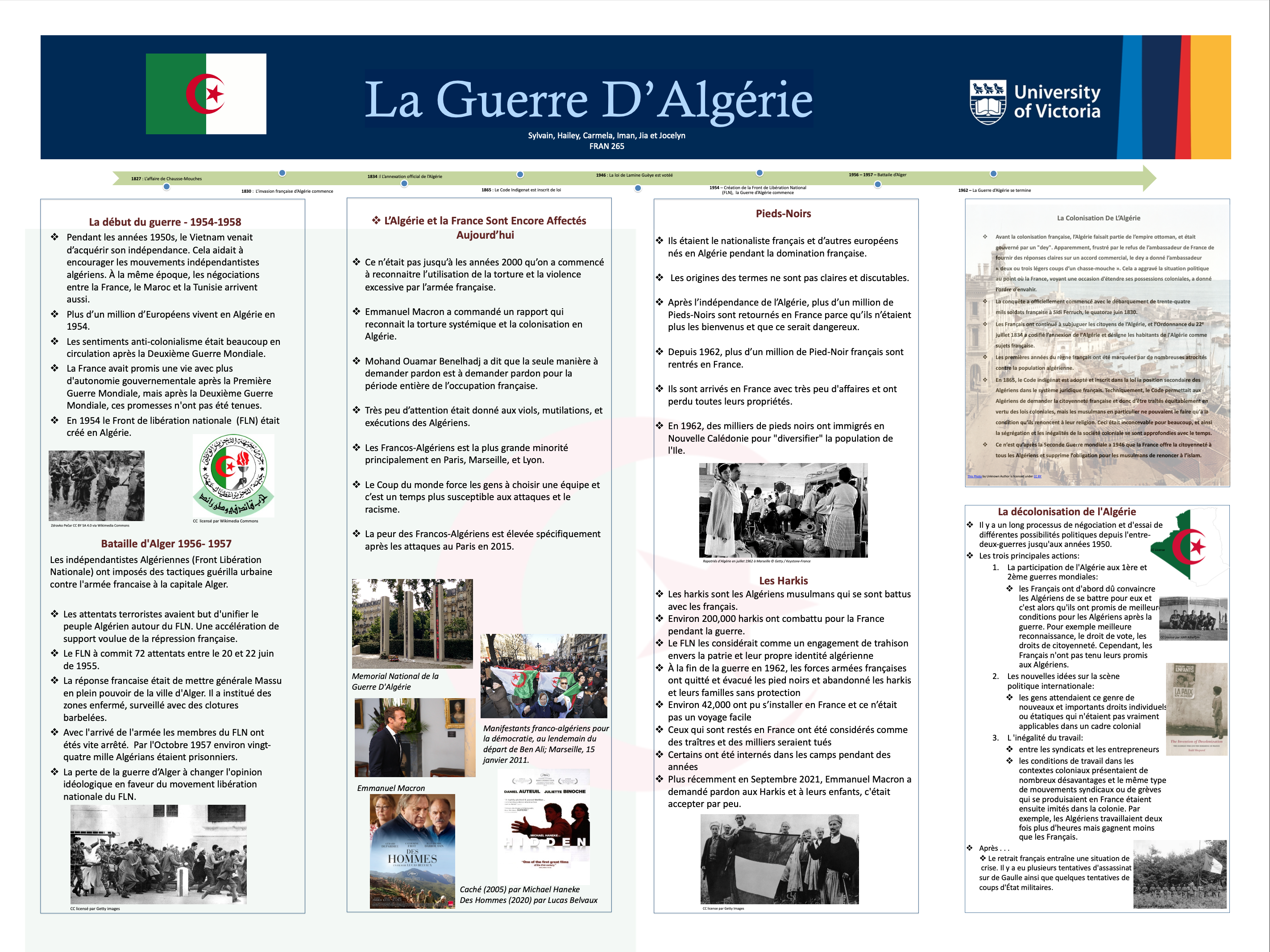 — À noter: le contenu des affiches n'engage que leurs auteurs et autrices; l'Université de Victoria, le Département de français, la Division Learning and Teaching Support and Innovation et le professeur Pierre-Luc Landry ne peuvent être tenu·e·s responsable des contenus partagés ici à des fins promotionnelles et pédagogiques seulement. Par souci d'authenticité, les affiches n'ont pas été corrigées et sont disponibles telles qu'elles ont été présentées lors de l'événement. —